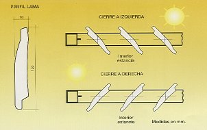 Datos técnicos :Las medidas de las lamas son de 120 x 18 mm. y se fabrican hasta un ancho máximo de 2,50 mts. El cerco se construye en tubo de aluminio de 50 x 50 mm. para el accionamiento a motor y de 40 x 40 mm. ó 40 x 25 mm. para los demás accionamientos. |